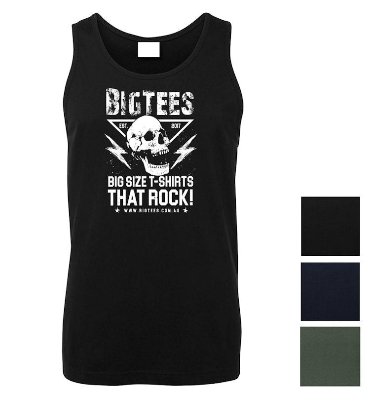 This singlet features our very own BigTees Australia Brand Logo - Skull Poster Design, printed on a mens fit singlet in a white print. Our BigTees Skull Poster tagline is "Big Size T-Shirts That Rock!", which is our trademarked slogan. Our logo is available in singlets up to 10XL in black and Navy. Khaki is available in up to 6XL only.