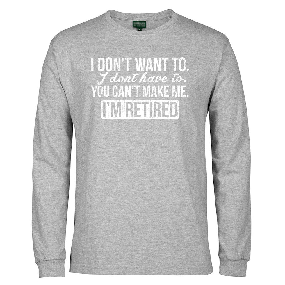 This funny retirement t-shirt reads: "I don't want to. I don't have to. You can't make me. I'M RETIRED". It'd make a great gift for anyone who has retired and wants to show a little attitude about it, we've given it a "distressed" style makeover. We've printed it here on a choice of black or grey long sleeve t-shirts, which is available in our full range of regular sizes and big sizes up to 10XL.