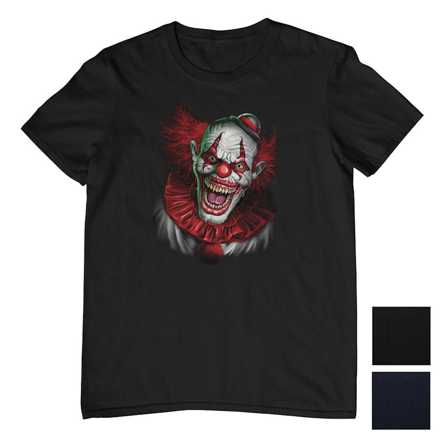 This t-shirt is called Red Killer Clown for the truly evil looking clown depicted in the design, it's almost straight out of a horror movie with his sharp teeth and menacing scowl! He has red hair, a little bowler hat with a red stripe, scary red lips and a red fringe around his neck. You wouldn't want to run into him anywhere - sure to be the stuff of nightmares! We're offering this scary clown print on black or navy colour options in our full range of BigTees shortsleeve sizes.