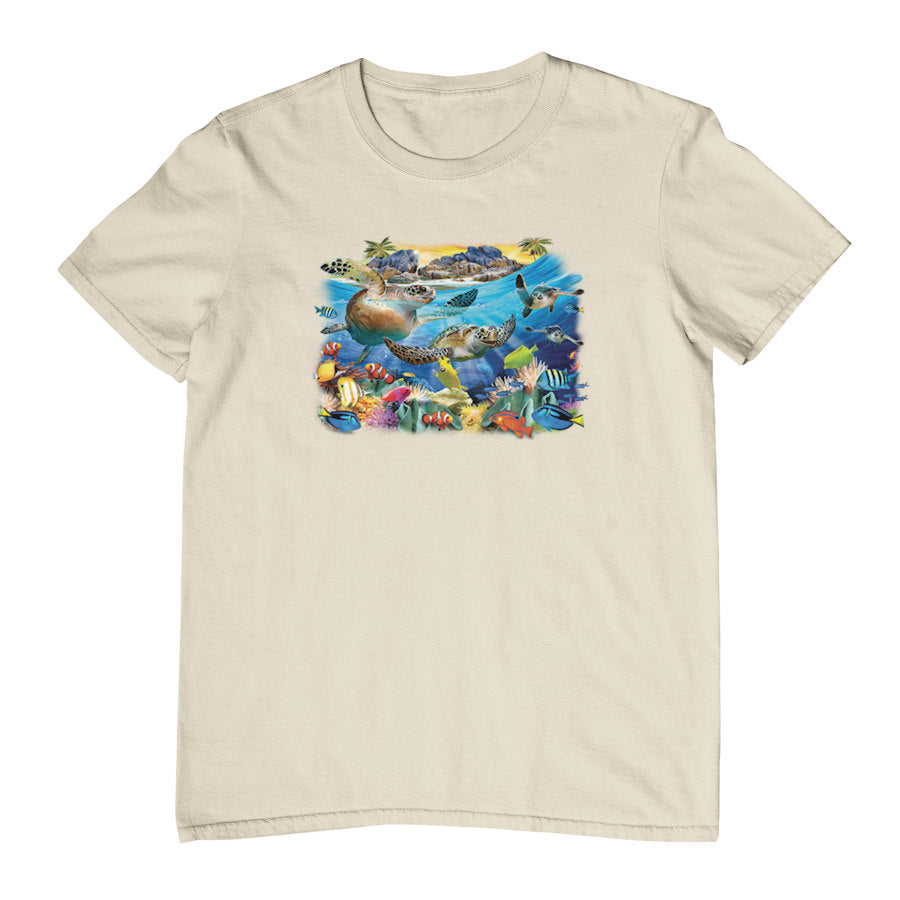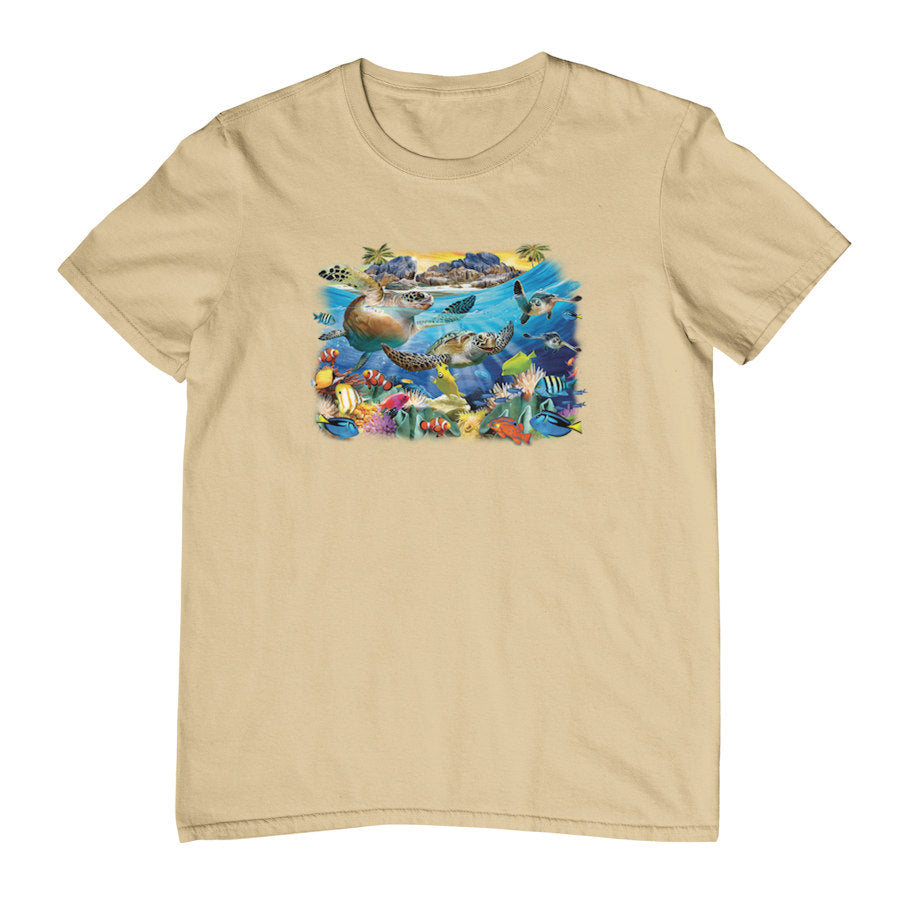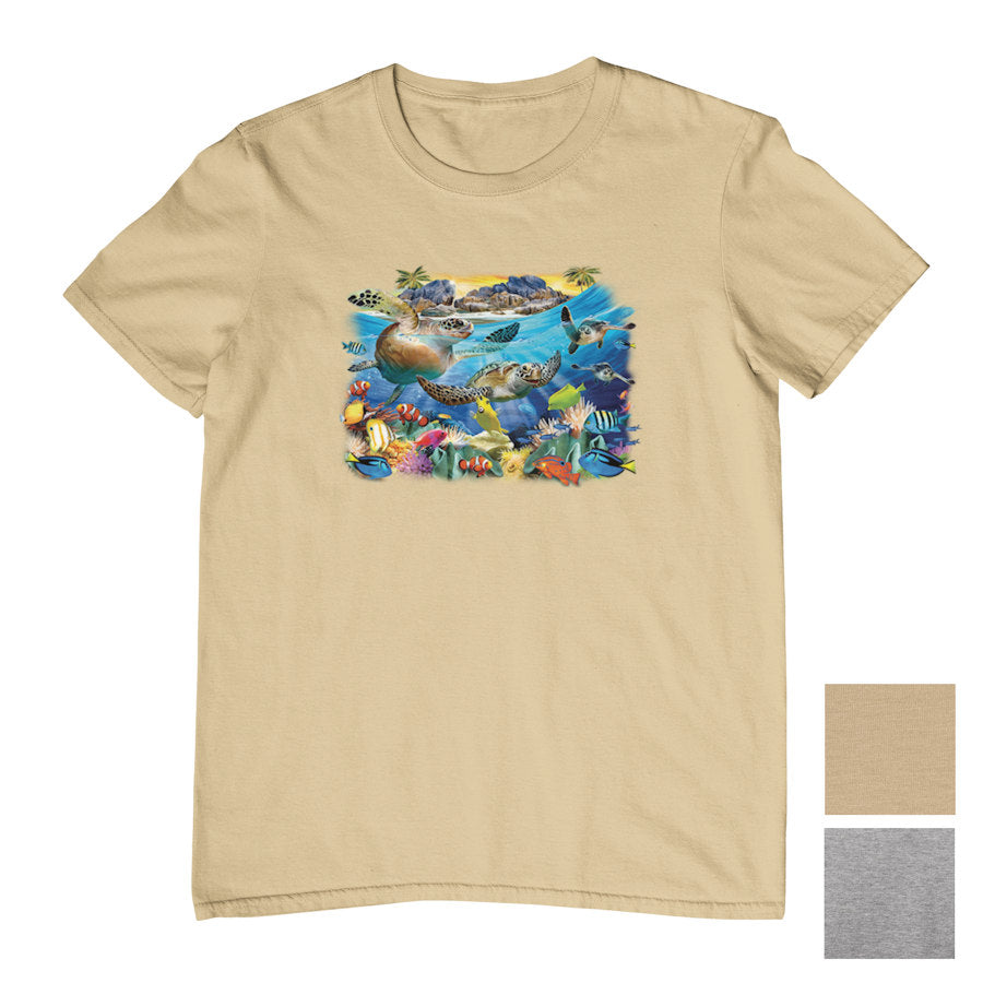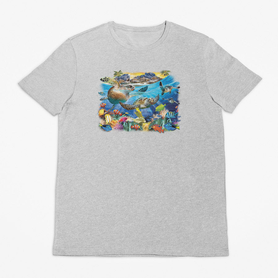 On this Turtle Beach T-Shirt we have a vibrant underwater scene featuring sea turtles gliding through crystal-blue ocean water, surrounded by colourful tropical fish, coral reefs, and marine life, with a sunlit island and rocks in the background. It's a lovely marine animal design, printed on our shortsleeve grey marle and tan tees in sizes up to 14XL!